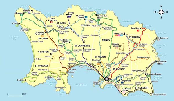 | E15M2B | The main town of Jersey is St. Helier. The island is divided into 12 parishes: Grouville, St. Brelade, St. Clement, St. Helier, St. John, St. Lawrence, St. Martin, St. Mary, St. Ouen, St. Peter, St. Saviour & Trinity. The population in 2014 was just under 100,000. | ![]() |