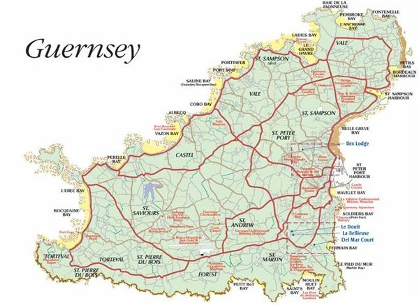 | E15M5A | Guernsey is the 2nd largest of the Channel Islands, covering about 24.5 square miles. The main town is St. Peter Port. The population in 2014 was just under 66,000. The island is divided into 10 parishes: Castel, Forest, St. Andrew, St. Martin, St. Peter Port, St. Pierre du Bois, St. Sampson, St. Saviour, Torteval & Vale. Much of Vale used to be separated from the rest of the island by sea-swamp but that was drained & reclaimed in 1806. |